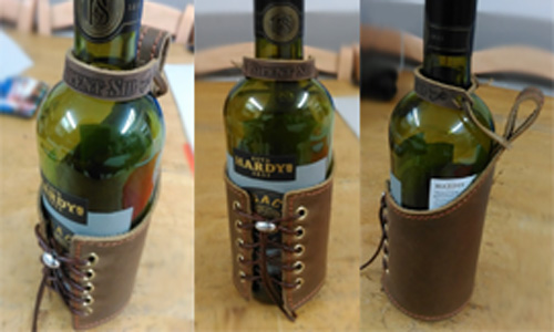 Our Standard Wine Bottle wraps (Bottles between 9 1/4"- 10 1/4" Circumference)and our Oversize Bottle wraps (Bottles between 10 1/2" - 11 1/4" Circumference)are both made with 2mm (5oz) Stoned Oil Cowhide leather which is treated with oils, waxes and dyes which gives the finish and 'Old World' effect or 'Aged' look as well as helping to fight against the odd splage or drible. If it gets marked or lightly scratched, the standard colours can be returned by rubbing the affected area to correct it. These bottle coats can be made with either Antiqued Bronze, Gun Metal or Brass coloured eyelets. They are also well suited for personalisation with a message or slogan (Anniversay, Birthday Wishes, Wedding dates, etc) please use the Contact form or email us for more information.