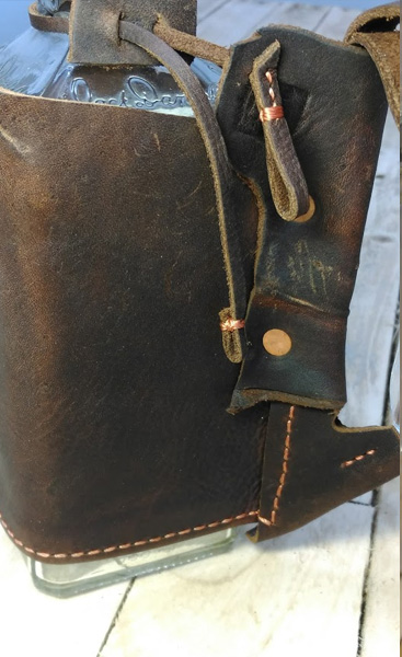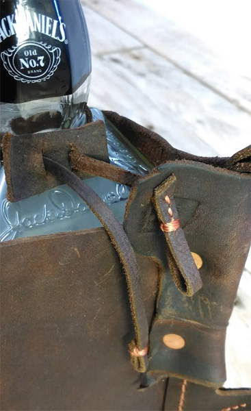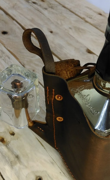 Below are unique bottle wraps. 'Sidekick' and 'Sparky' are cut from Kodiac 2.5mm thick Cowhide. This leather has that aged and beaten look that goes really well with Bourbon bottles. Both have hand set copper rivets which helps ooze that rugged look and feel that these wraps have.