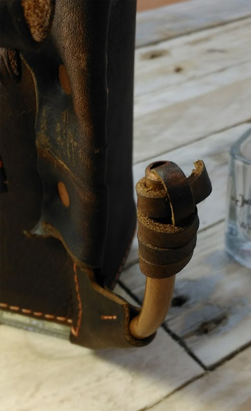I used to just pop my shot glass on top of the bottle, not anymore! This idea of having a 'Sidekick' to hold my glass really gives this wrap the edge. We've had this on display in our workshop and it is by far THE most looked at and commented on piece in the place. The glass holder is fabricated out of 3/8" (10mm) copper pipe with a leather lace covering. You can hang this from a peg (even with a shot glass perched on the holder) or leave it looking 'meaningful' on display ANYWHERE.