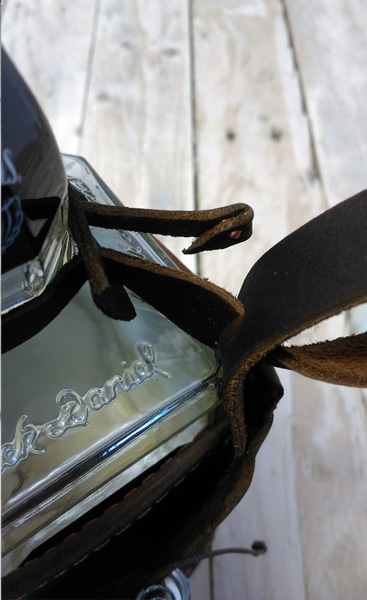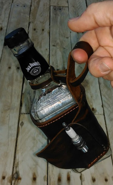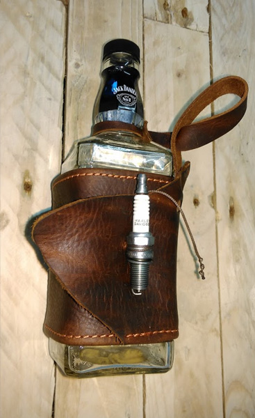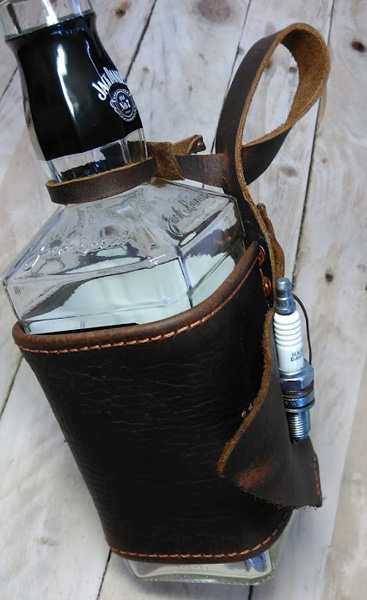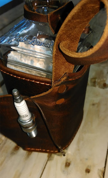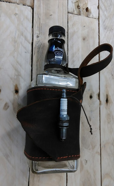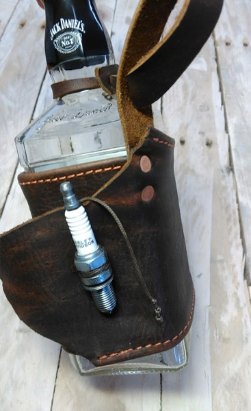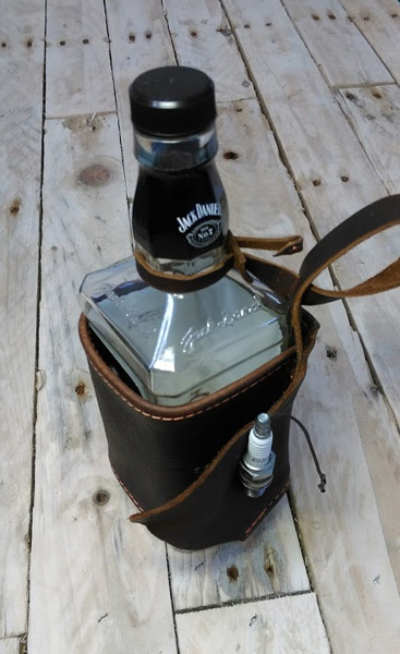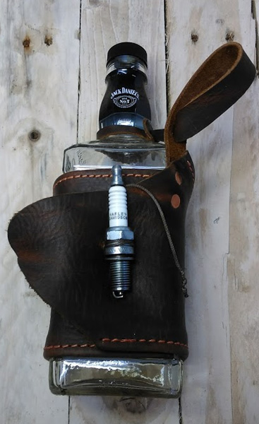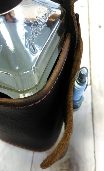 This is our 'SPARKY' wrap. This wrap works on round bottles too. I was looking for a feature closure and what better thing to use than a genuine used Harley Davidson Spark Plug from our last Harley build. Again, this can be hooked up somewhere or placed on a shelf as a cool functional display item. Hey, you could even use it as an excuse (if you need an excuse) to carry a loaded bottle with you on your daily ride, class it as a tool orspares holder - the Spark Plug is perfectly good to go ;)