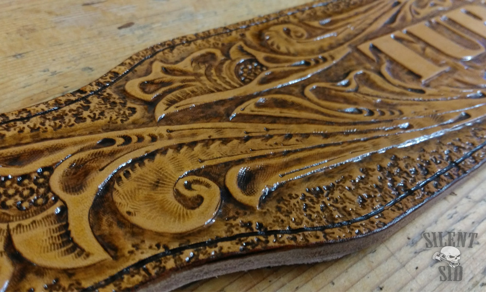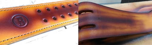 We let the dye set for between 12-24hrs before adding a protective finish (like Fiebings Resolene or Tan Kote) which gives varying degrees of shine and ensures the belt stays looking good for longer.